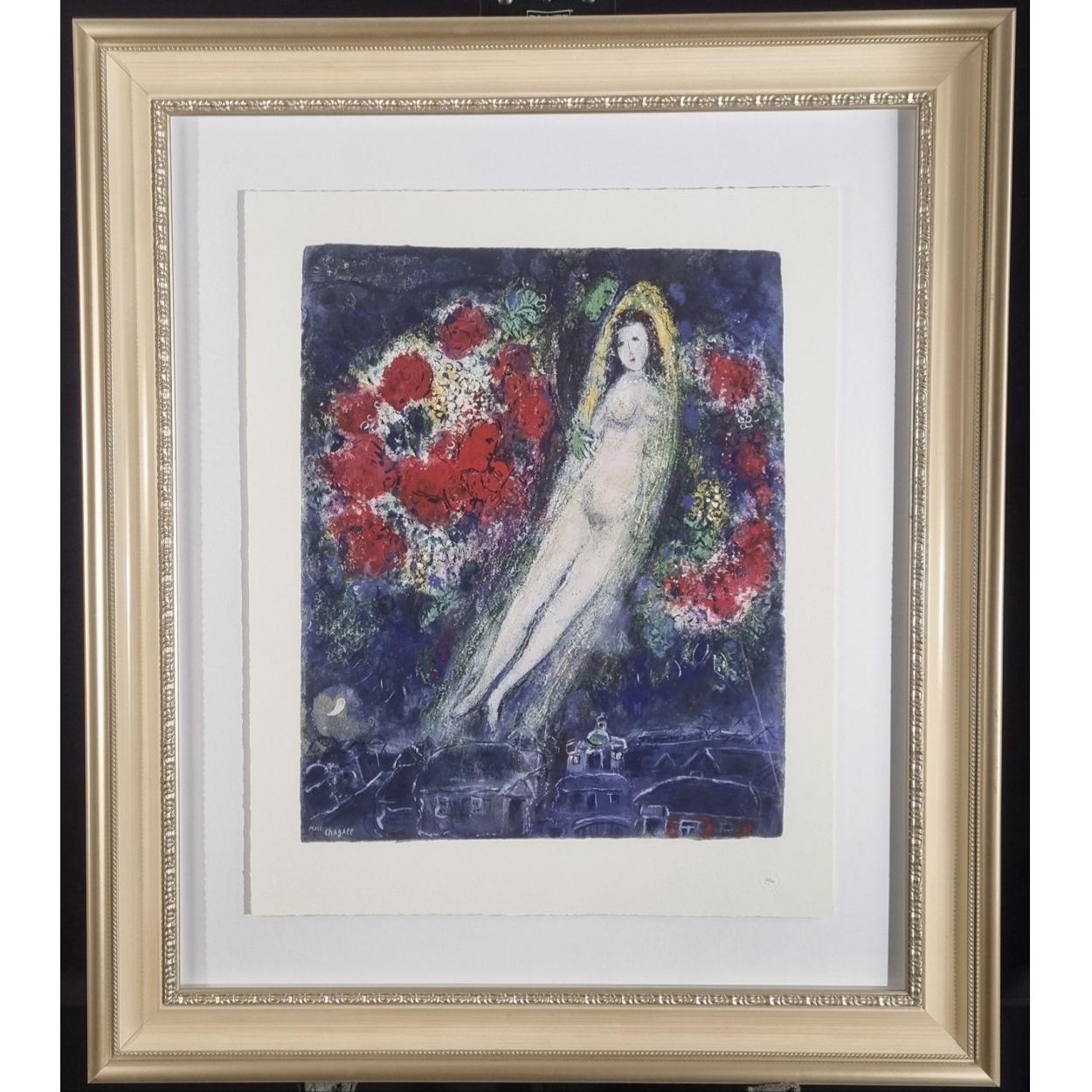 This limited edition by MARC CHAGALL (one of only 50 Worldwide) Supplied with certificate of authenticity. The framing of this piece is high quality with the image float mounted and framed in a hand made frame. The limited edition will be supplied with a replacement valuation for £1800 (free of charge) Published with light-fast inks to BS1006 standard onto acid-free, calcium carbonate-buffered stock, mould-made from 100% cotton. "Bride with Flowers" was painted by Chagall in 1960. Dating towards the very end of his active artistic life, it is a fine example of Chagall's work, embracing many of his familiar themes of love and marriage, fantasy, space and urban skylines.. H: 105cm W: 91cm D: 4cm
