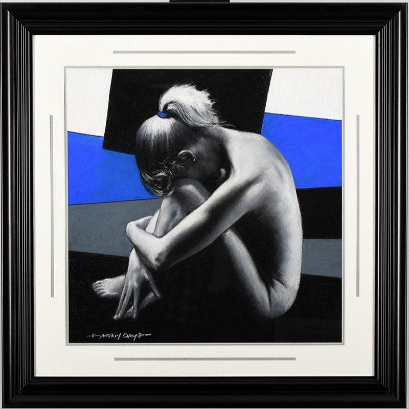 A very fine original pastel painting by English artist ANTHONY ORME, titled "Thoughts in Blue II". Superbly framed with art mount. In excellent condition. Will be suppled for a replacement valuation for £2000 free of charge.. H: 88cm W: 88cm D: 4cm