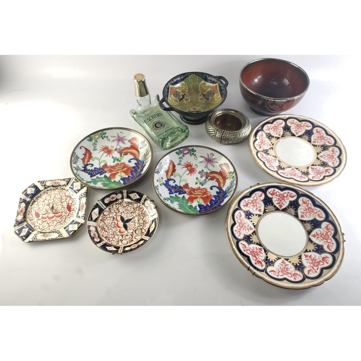 A mixed small lot to include pretty decorative wall plates, some Oriental, an Indian bowl, a Ridgeways bowl, a Gouda style tazza and a TEACHERS 'melted bottle' style ashtray.