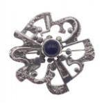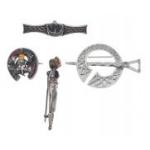 Small Scottish jewellery collection to include small silver dagger pin with silver hallmarks 5cm, a Longship brooch with hallmarks 5cm, Horseshoe brooch with inset hardstones 2cm and an annular brooch with fixed pin. Four lovely pieces. Gross weight 26.5g approx.