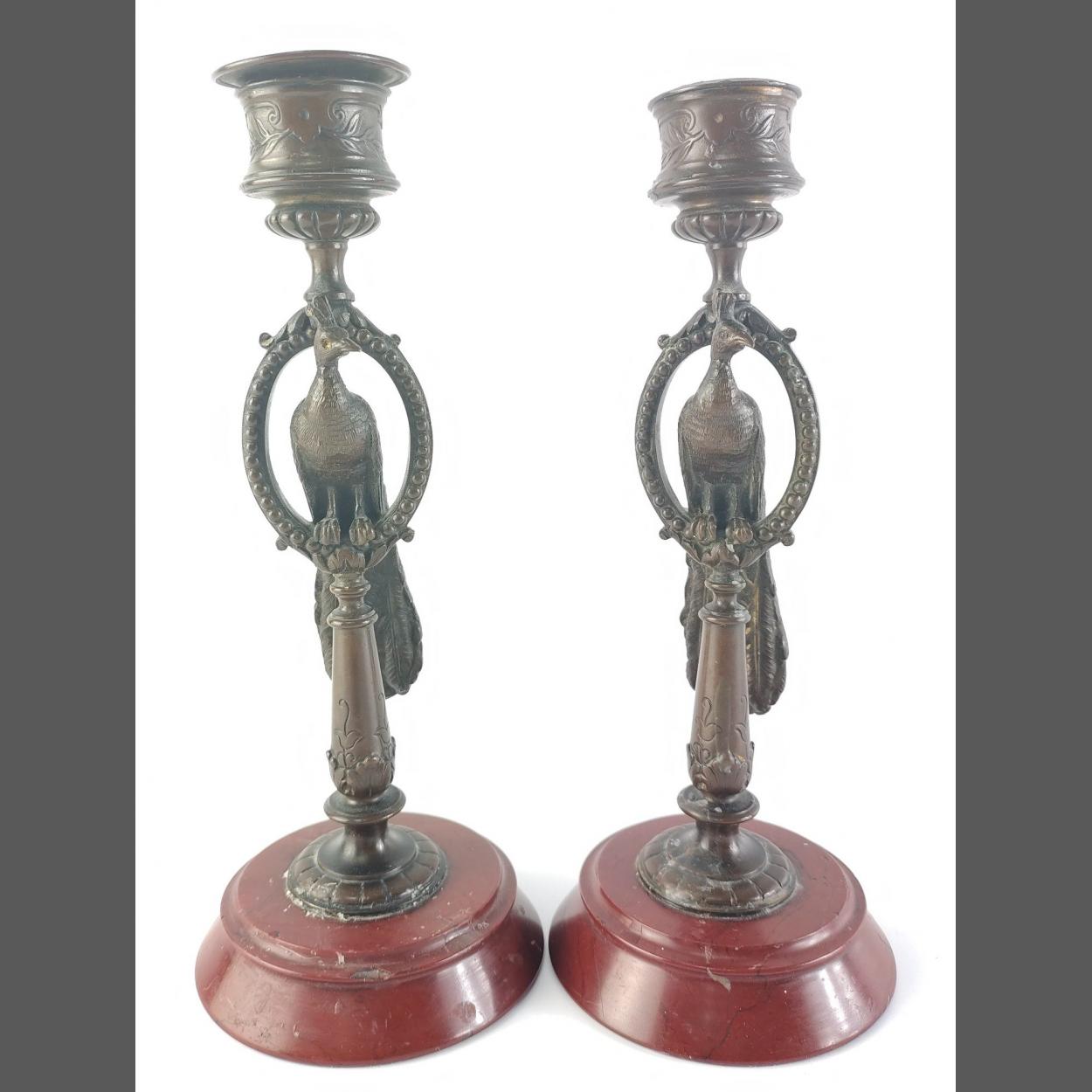 Unusual and stylish heavy cast candlesticks depicting peacocks on stand. Each approx 19cm tall. Believed Russian albeit appear unmarked. One missing sconce top.