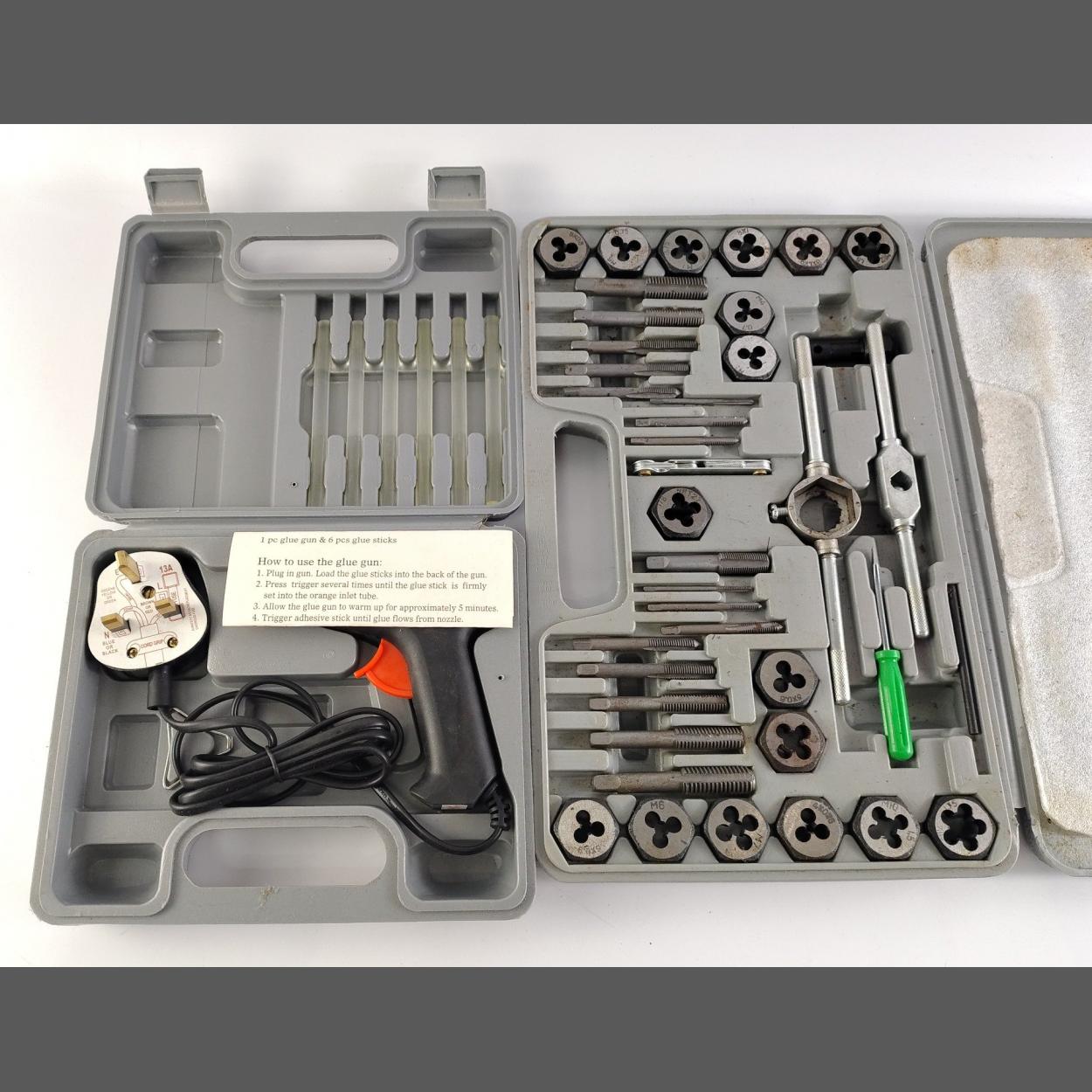 Cased tap and die set and a cased glue gun.