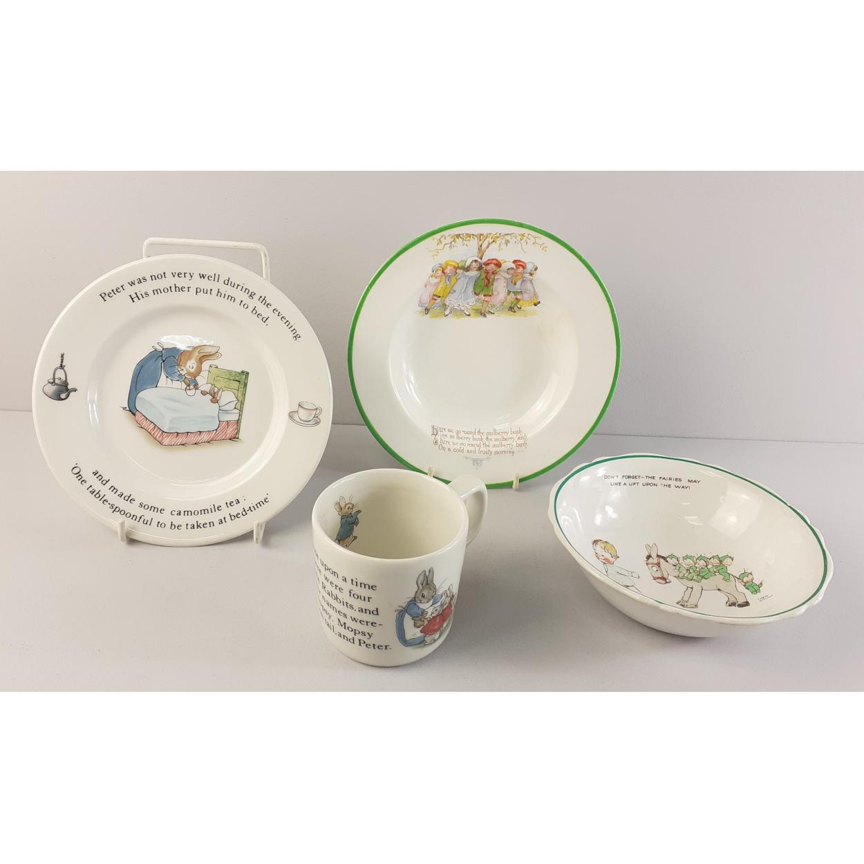 A cutsie little lot to include SHELLEY Mabel Lucie Atwell bowl Wedgwood Peter Rabbit cup and saucer and one other.