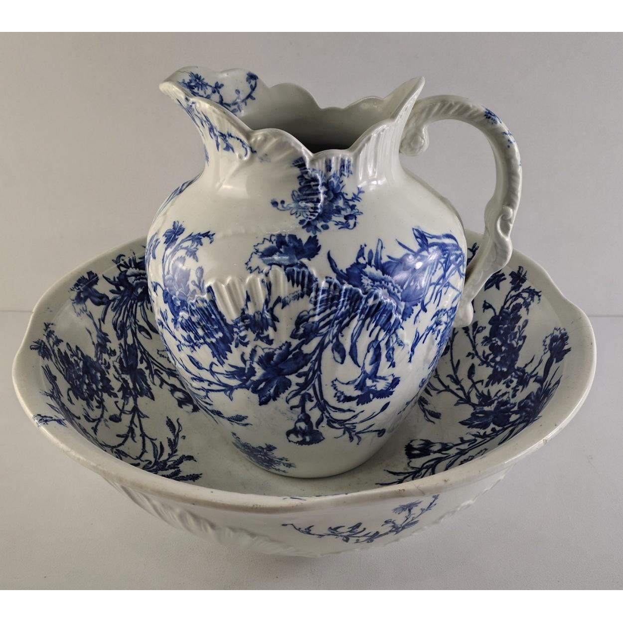 A large blue and white ewer and bowl set. Victorian reg. mark no. to base. Cracks noted.