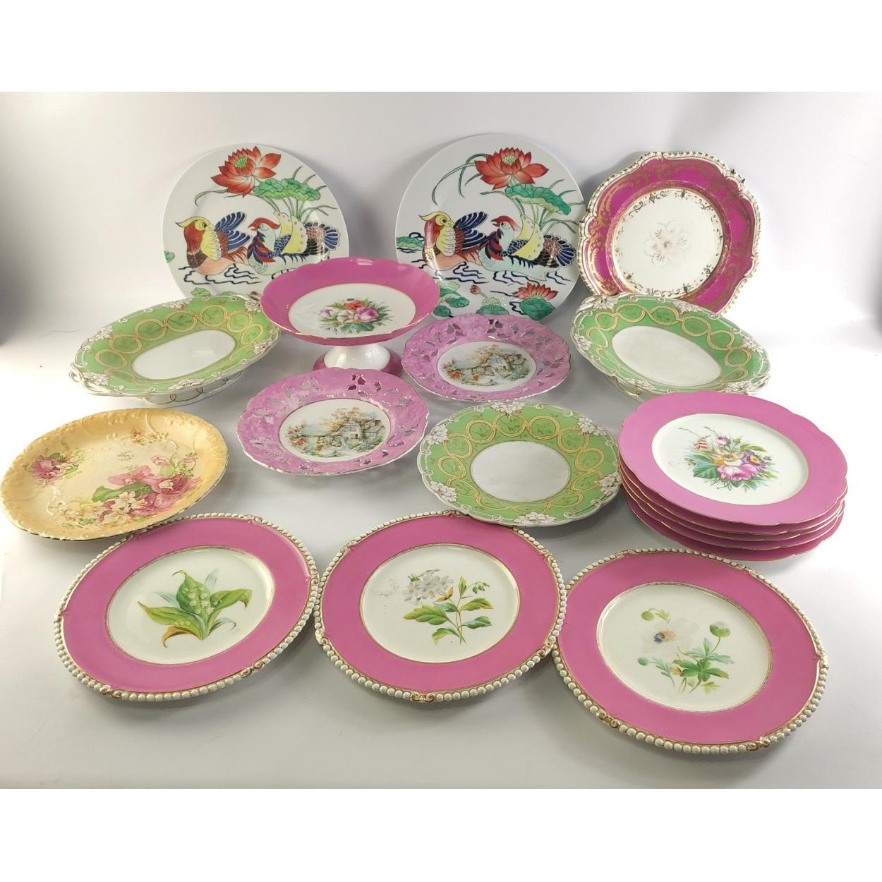 A box of mixed ceramics to include highly decorative wall plates and others. With two decorative tazzas and a compote.