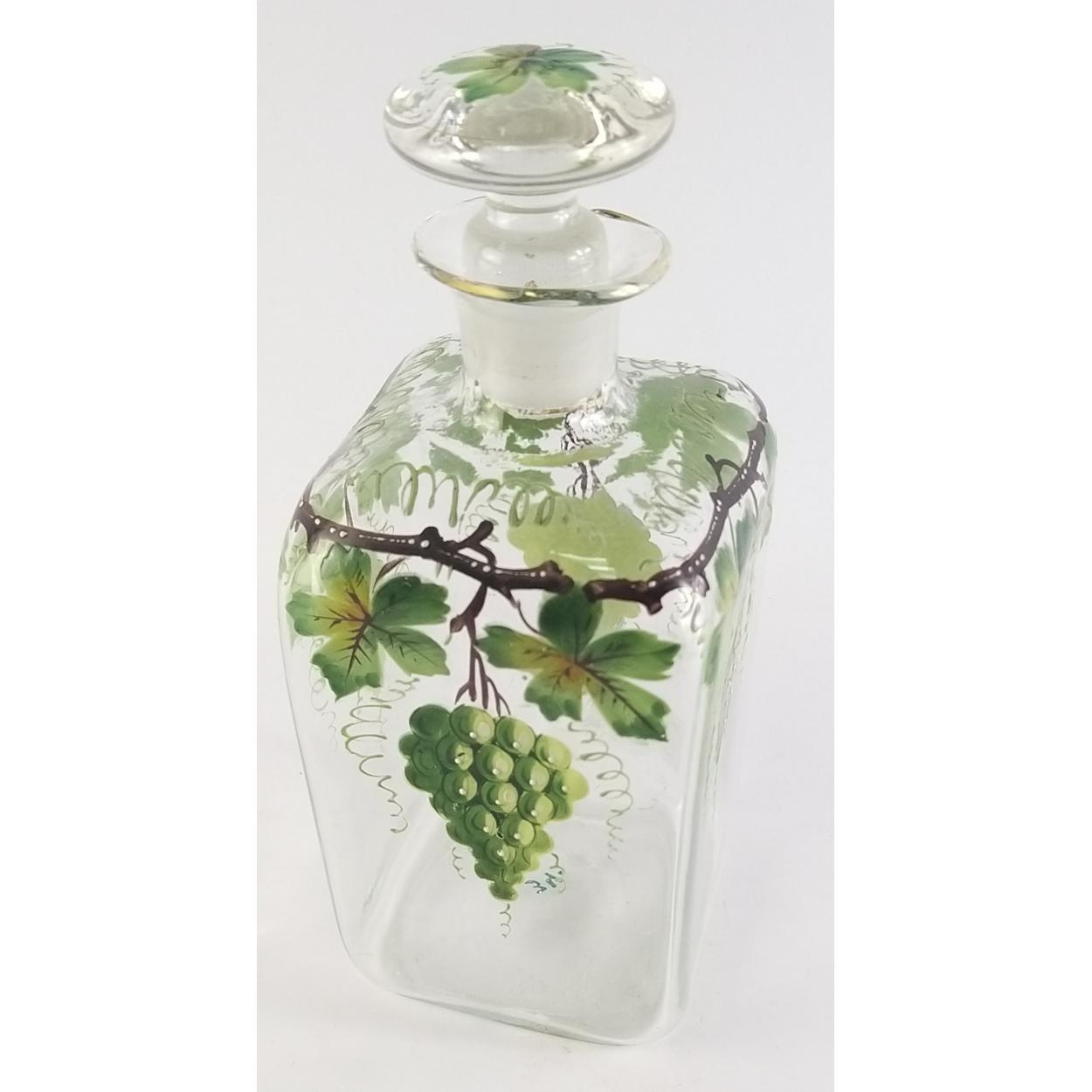 A vintage hand painted glass decanter with grape and vine hand painted design. Stands 21cm tall and in great condition.