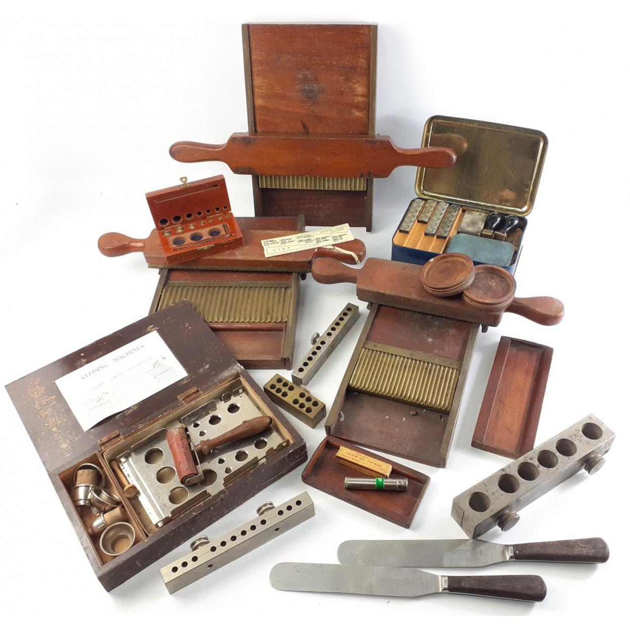 APOTHECARY LOT! A box of great vintage Apothecary pieces to include three pill rolling machines, pill moulds, a box of pill stamps, weights etc.