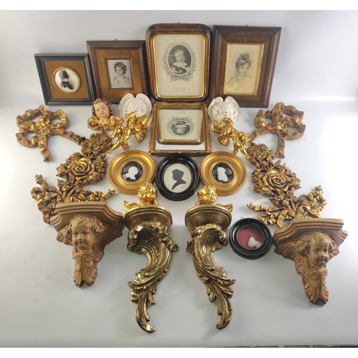 A box of good quality interesting wall art pieces to include wall sconces, cherubs, plaques, portraits etc.