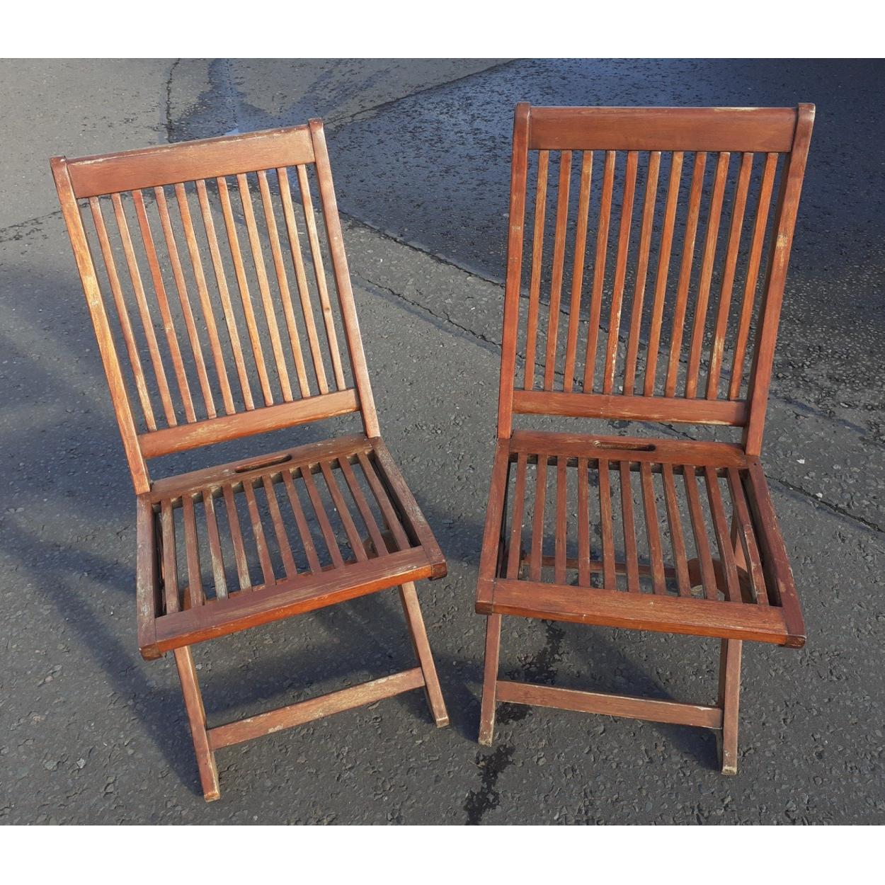 Two wonderful older folding wooden deck chairs. Great quality and handy useful chairs in good used order.