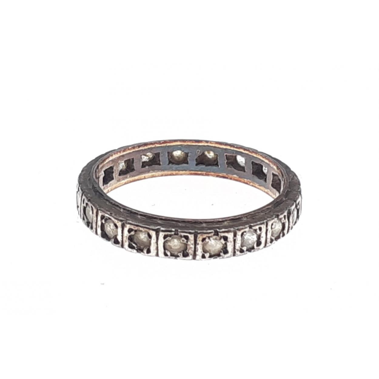 A fully hallmarked 375 / 9ct gold eternity band with stones. Size N, gross weight 2.7g approx.
