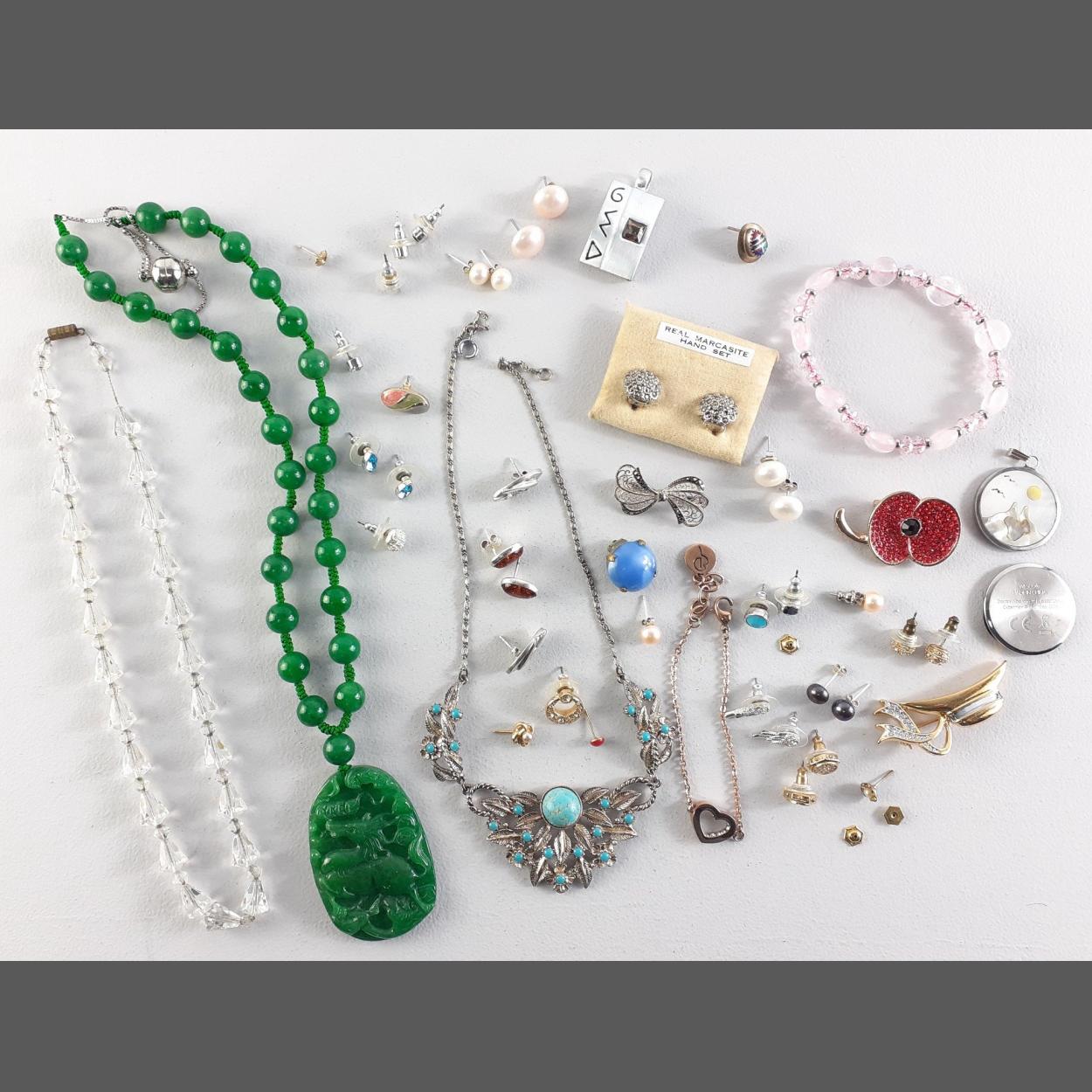 A collection of costume pieces of jewellery to include a rather nice JADE style necklace and pendant and various pendants and and some silver items etc etc