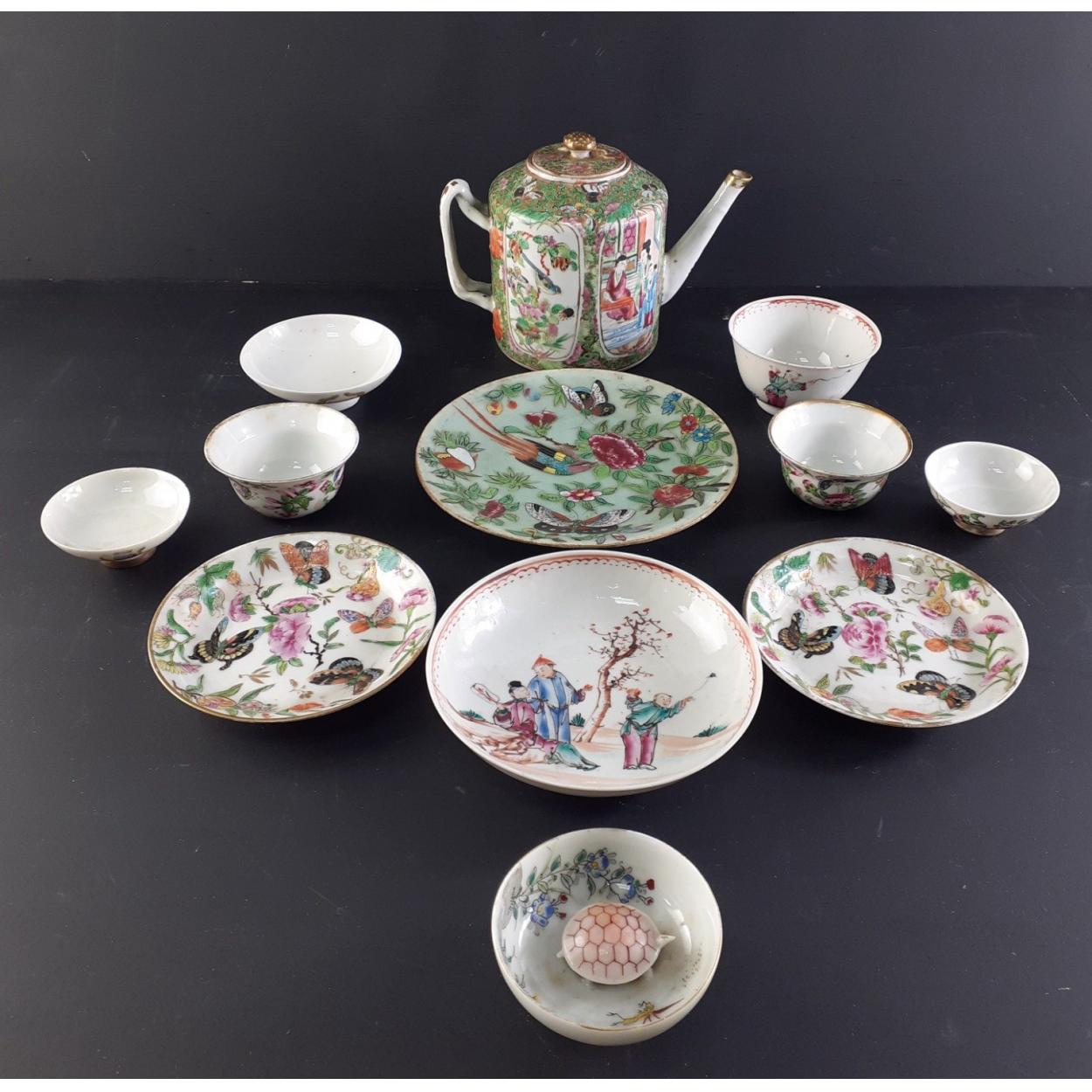 A lovely lot of small Chinese ceramics to include a pretty green floral teapot with similar plate. A whimsical soy bowl with turtle inside and various other small bowls. Minor chipping noted to a couple of pieces.