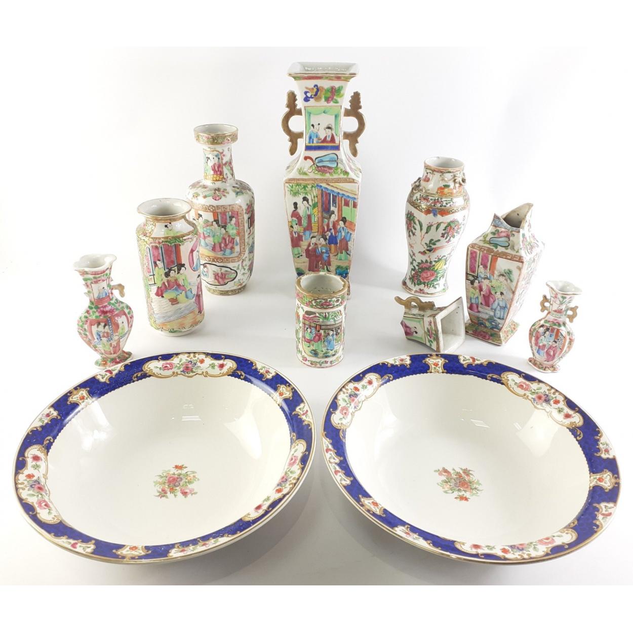CHINESE ceramics. An interesting collection of vases etc. one damaged but broken piece is there, also two large 25cm European bowls.