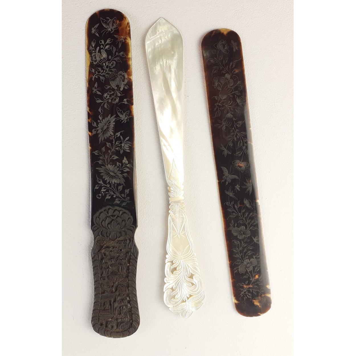 Three antique page turners. One Mother of Pearl, two turtle shell. All in good condition.