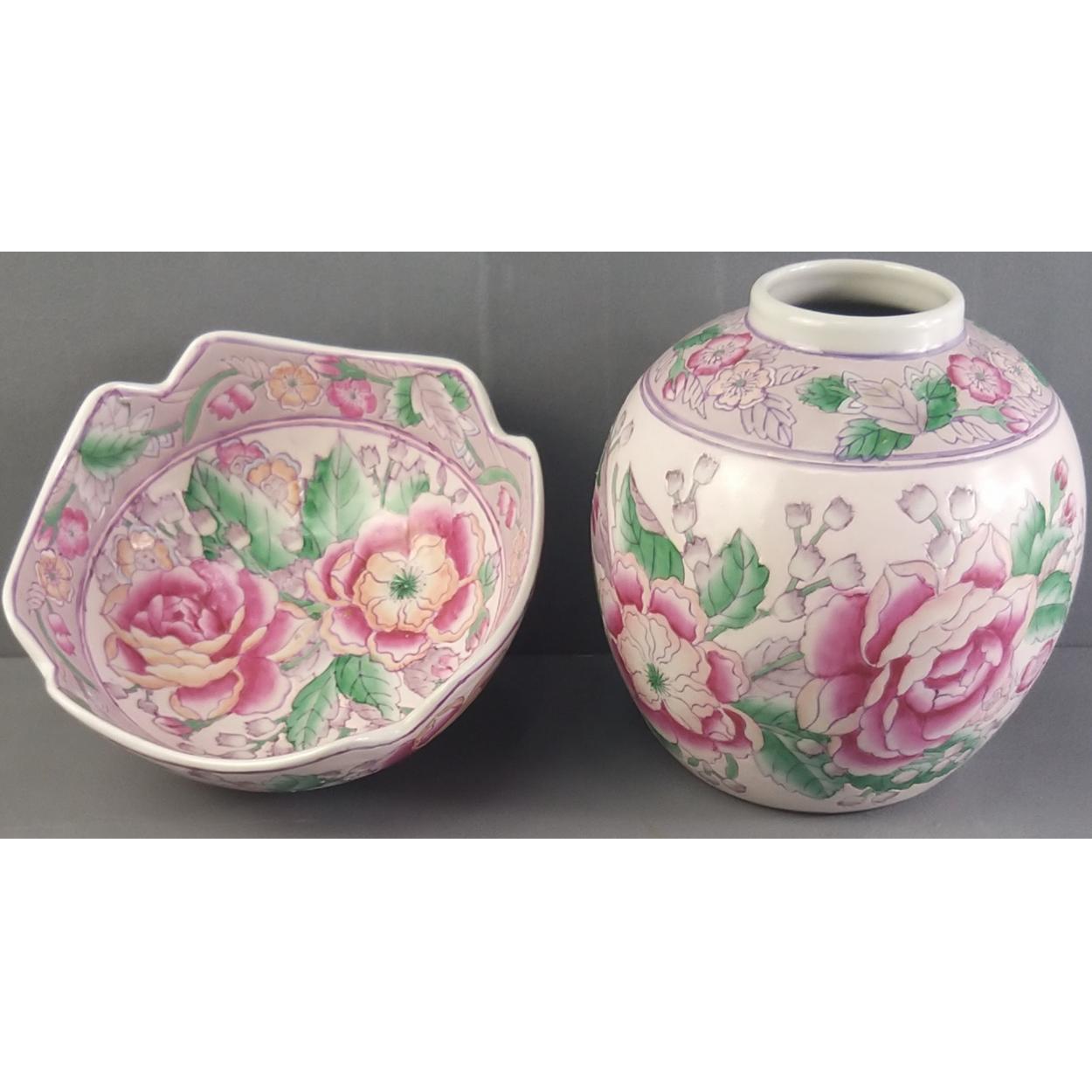 An attractive Oriental small Lotus vase and matching jar. Jar stands 12cm tall approx.