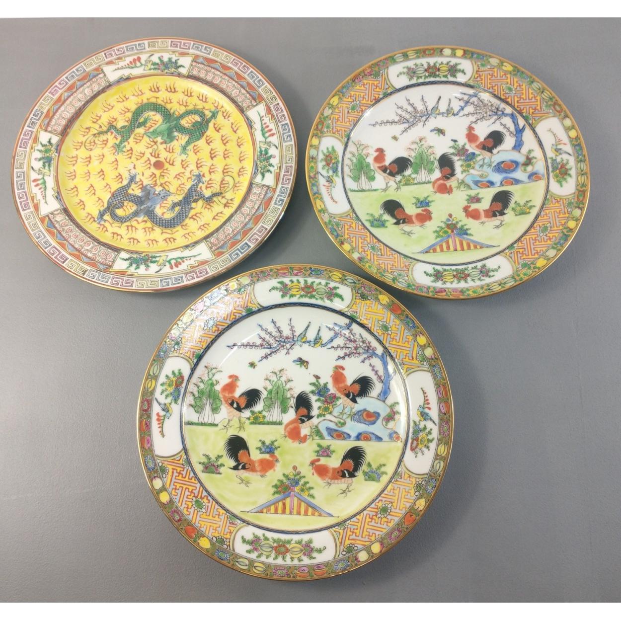 Three ORIENTAL plates 25cm approx. Very prettily decorated with cocks and dragons.