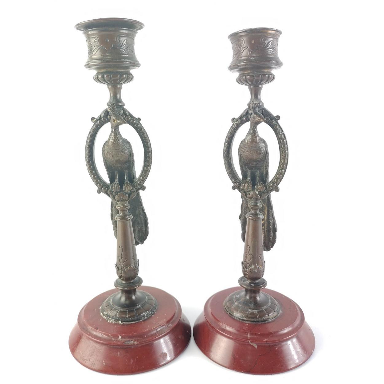 Unusual and stylish heavy cast candlesticks depicting peacocks on stand. Each approx 19cm tall. Believed Russian albeit appear unmarked. One missing sconce top.