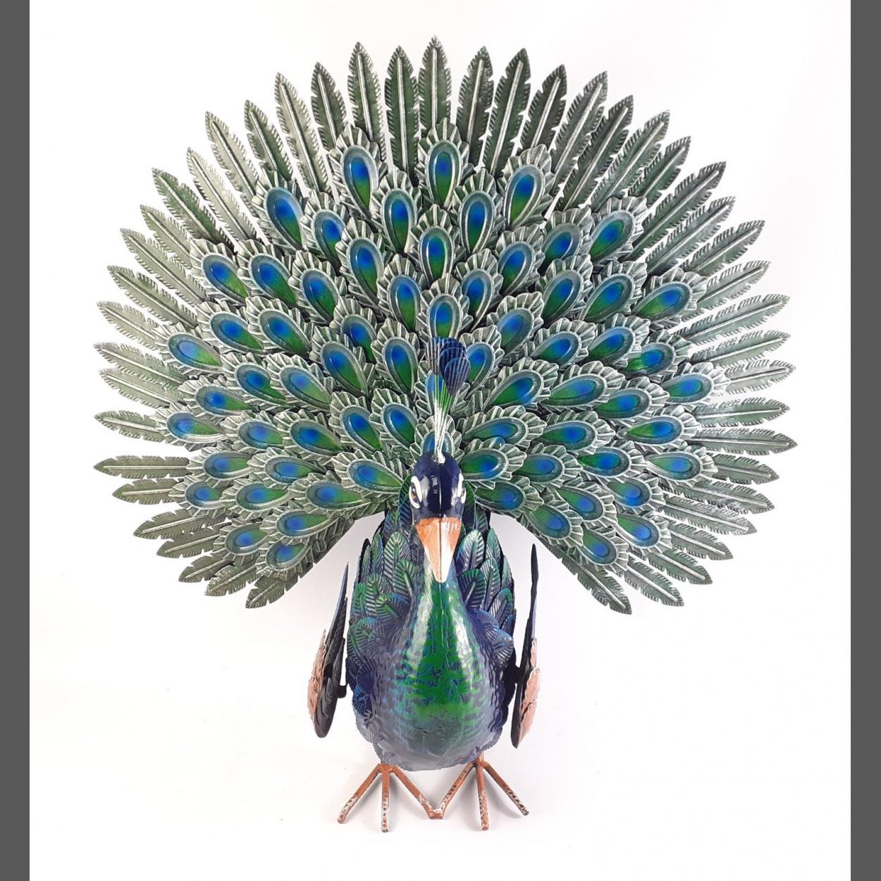 A large ornamental metal peacock standing an impressive 66cm tall approx with a wingspan of 63cm. Lovely colourful chap in great condition.