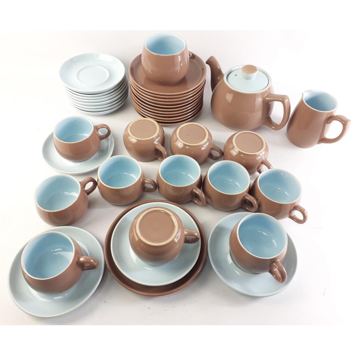 DENBY LANGLEY tea service comprising teapot, cream & sugar, twelve side plates and twelve each of cups and saucers.