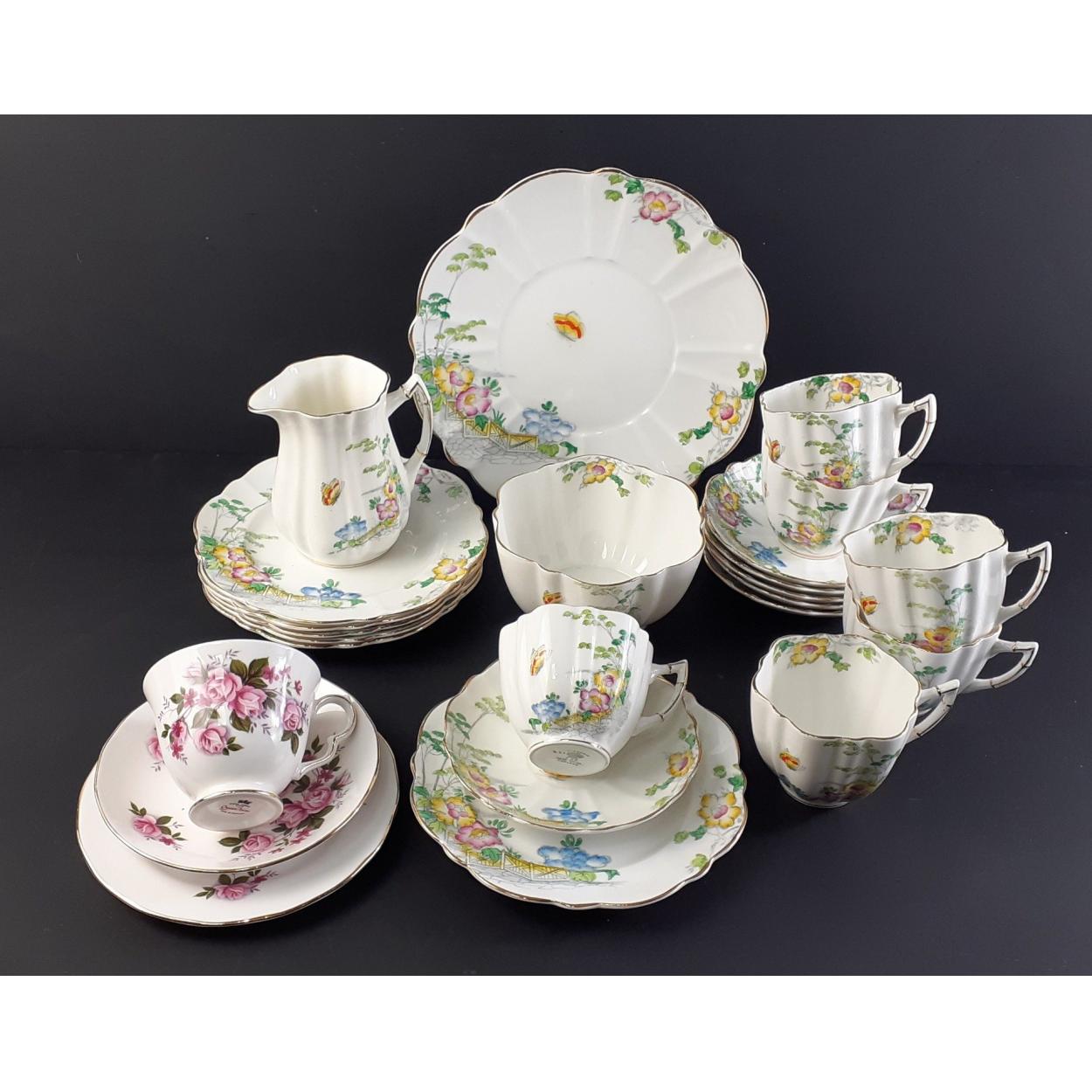 VICTORIA bone China part tea service with floral and butterfly pattern, comprising milk & sugar with six each cups, saucers, side plates and cake plate.