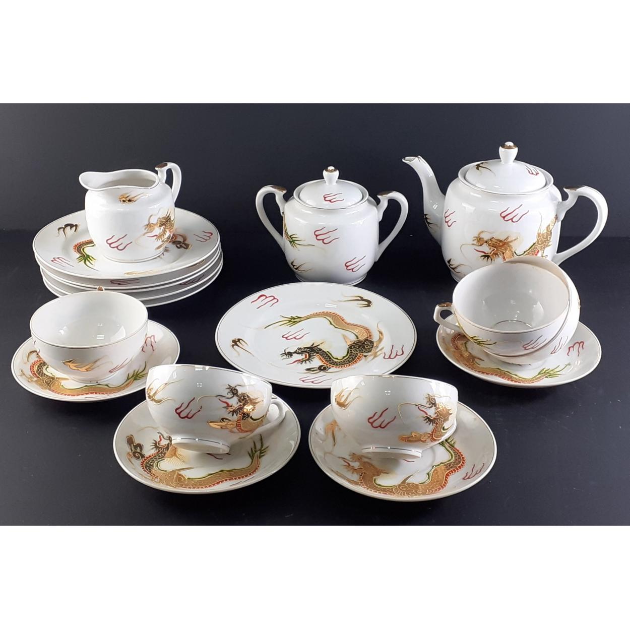 A part Oriental tea service with geisha head in base of cups. Comprises 5 cups, 4 saucers, 6 plates, teapot, milk and sugar. All in good condition.