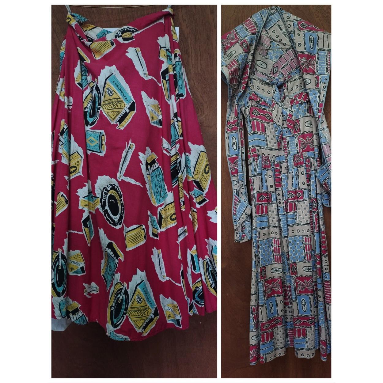 PERCY TRILNICK 1940/1950S Beachfront print dress and wrap. Along with a similar age height of fashion dress and underskirt with super cigarette design pattern. Lets Rock n Roll !