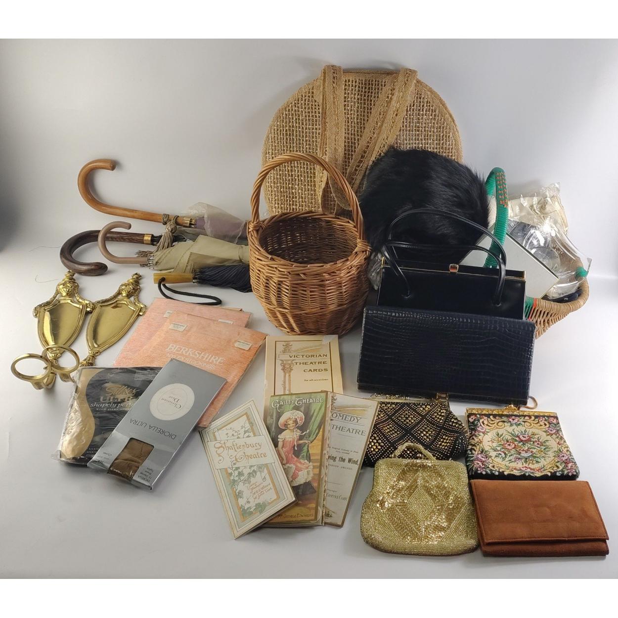A mixed lot of interesting items to include rolled brollies, vintage tights / stockings, a muff, various handbags, small wicker basket, gloves and much else