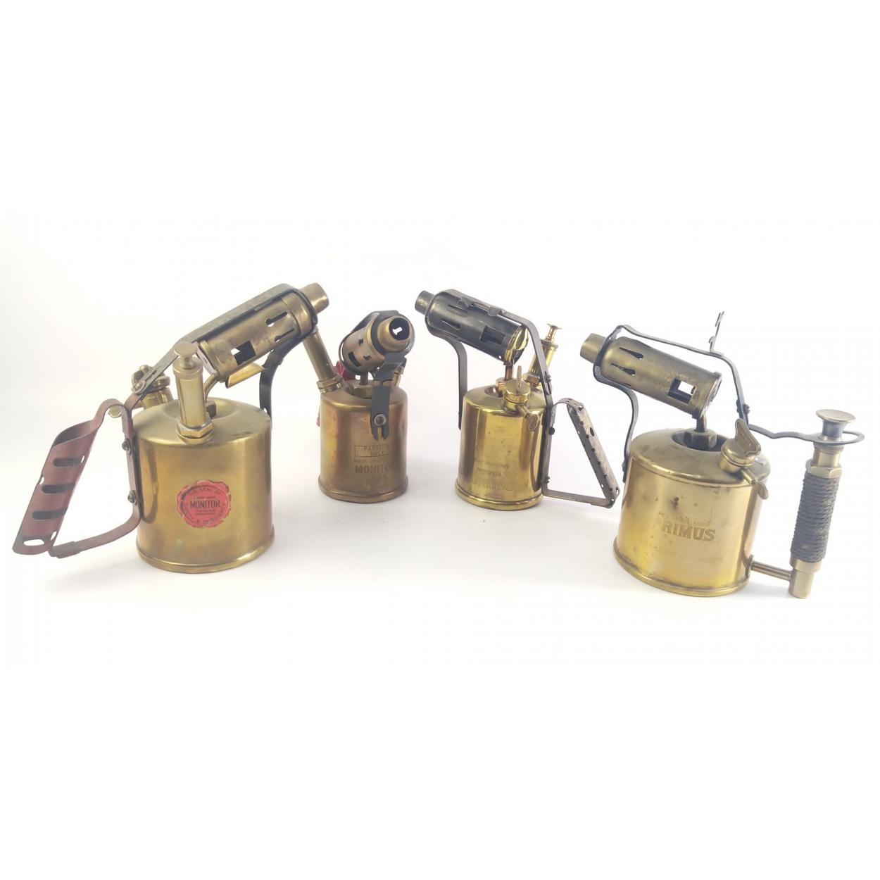 Four antique brass blowtorches. Primus, Burmos and two x Monitor