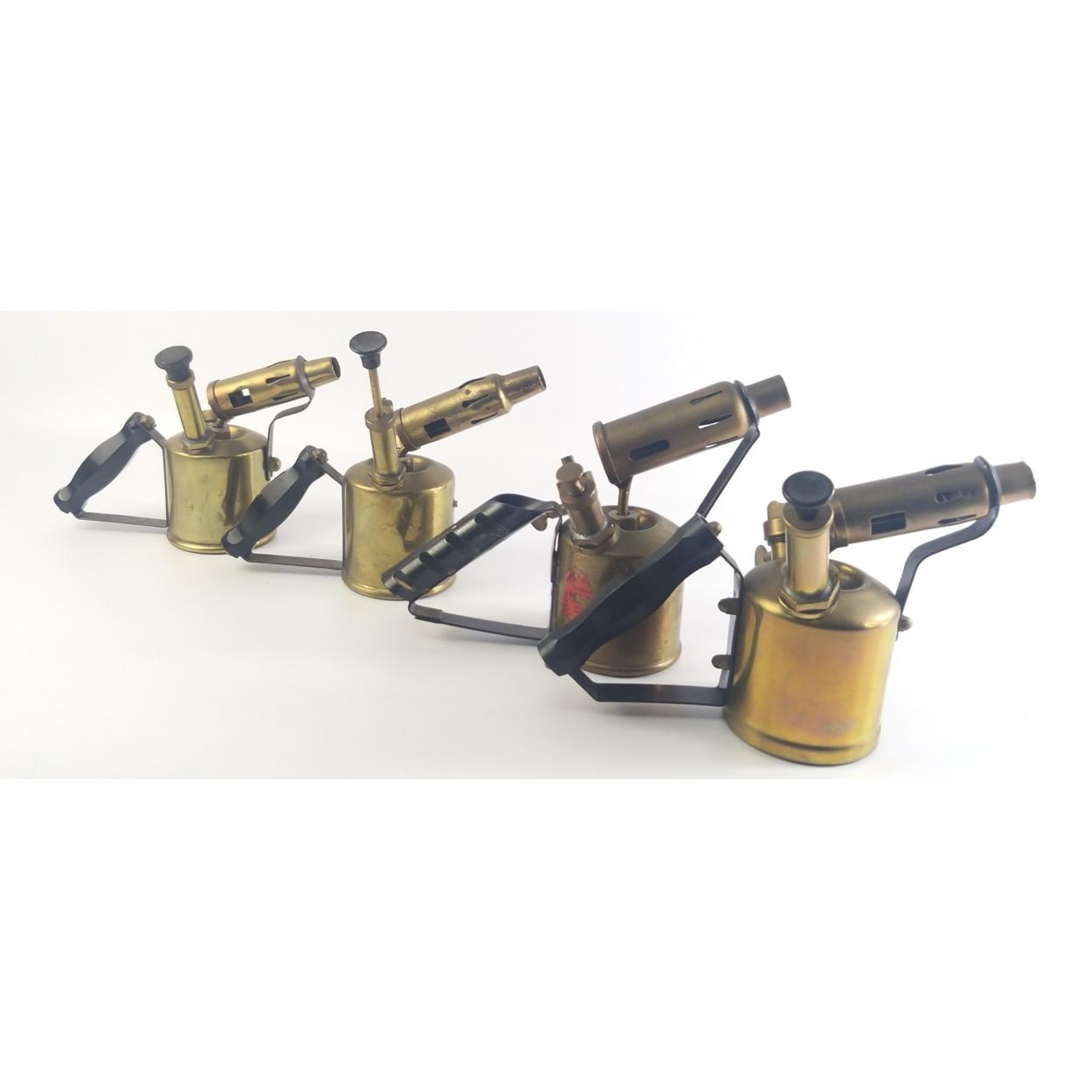 Four vintage brass blowtorches.