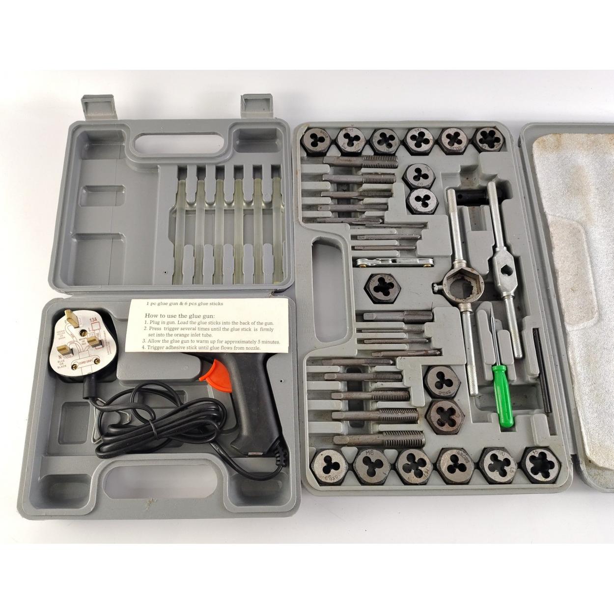 Cased tap and die set and a cased glue gun.