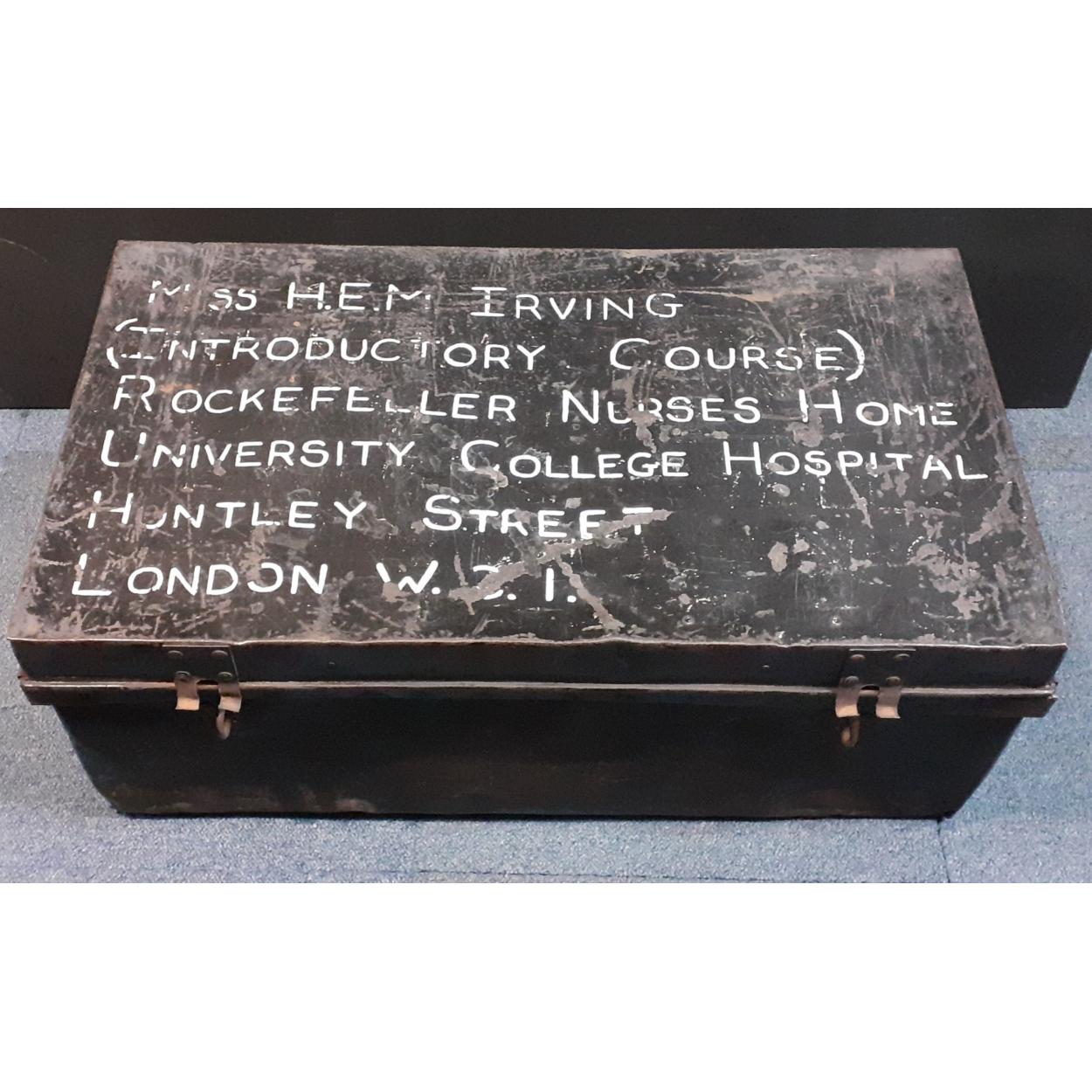 A large tin trunk, great for storage or a quirky coffee table. Rockefeller Nurses Home London interest. Measures 33 cm high, 82cm wide 45cm deep approx.