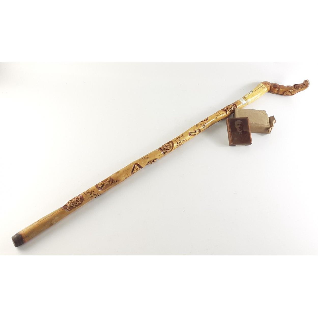 A MASONC interest WALKING STICK dated 1977 made especially for a brother of Lodge 919. Wonderfully decorated with Masonic carved symbols and decoration. 90cm approx and in great condition. Coming with a Masonic interest printers block.