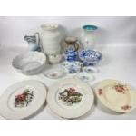 A box FULL of (antique mainly) ceramics to include a nice pottery storage jar with lid 10.5" tall, a vintage twin handled pretty lidded blue and white dish and much more