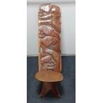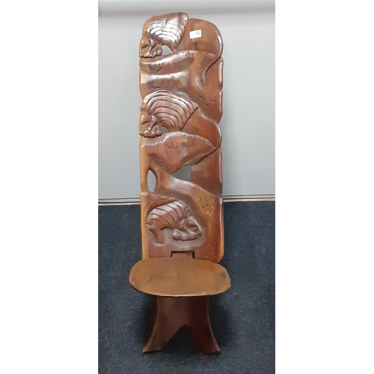 Interesting South East African wooden CHIEFTAINS/BIRTHING CHAIR carved with stylised lions. Small older label on rear reads ''The African Collection, Fountain of Knowledge. A collection of manmade crafts carved by the Artists of Africa, Malawi. Lovely item in two pieces. Back stands approx 42"
