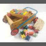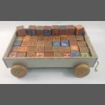 A child's vintage wooden pull-along trolley filled with wooden blocks 43x26x12xm