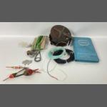 A NOTTINGHAM style 5" antique wood and brass fishing reel plus various fishing equipment including reels and flies