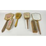 Two dressing table sets of brush, mirror and clothes brush, one with hand-embroidered flower design