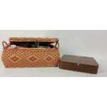 A traditional style wicker SEWING BASKET rammed full of haberdashery items including pins, threads, darning mushroom, etc, and a wooden extension box for a sewing machine 20x19x5cm with spare needles and an (old) tube of Singer lubricant for electric motors