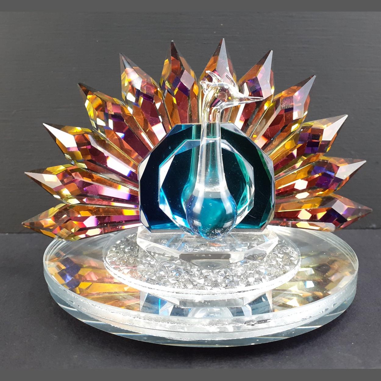 A limited edition on a SWAROVSKI silver crystal peacock on a dazzling mirrored base roundel - dimensions 12cm wide x 7cm height approx