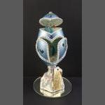 FABERGE egg style hand cut and decorated by Joanne Teasdale - features two swans within the lid and twin doors - 13cm height approx