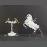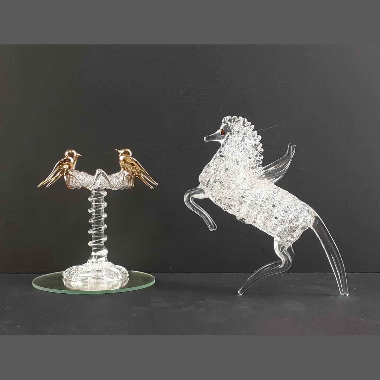A hand-blown PEGASUS horse on hind legs - also a clear spun glass bird bath figurine featuring two gold toned kissing doves on a clear glass pedestal base max height 11cm