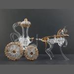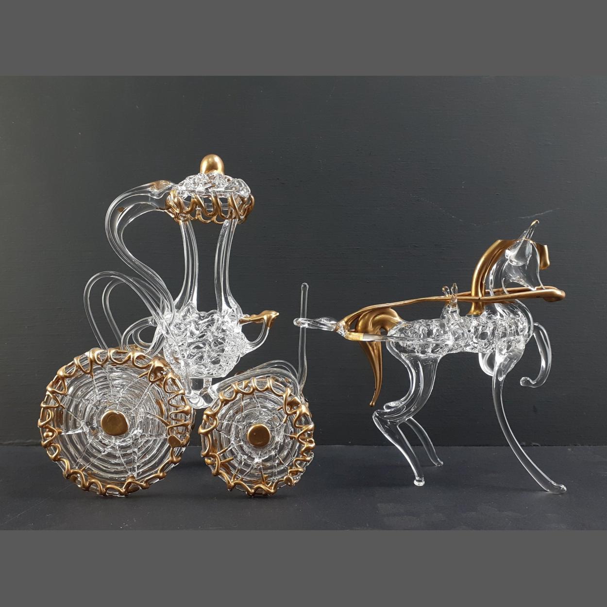EXQUISITE! - A handmade glass-blown horse drawn carriage in clear glass with decorative gold tone accents pulling a pumpkin style carriage - dimensions 11cm height x 19cmlength