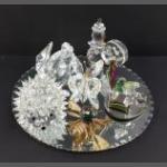 A collection of SWAROVSKI glass crystal ornaments on a mirrored roundel base to include little clam shells, crystal orbs etc