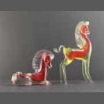 Italian MURANO style glass horse ornaments, one figurine standing tall and the other lying down, the taller in red and yellow colourtones the smaller in red and clear glass colourtones - tallest height an impressive 25cm tall approx