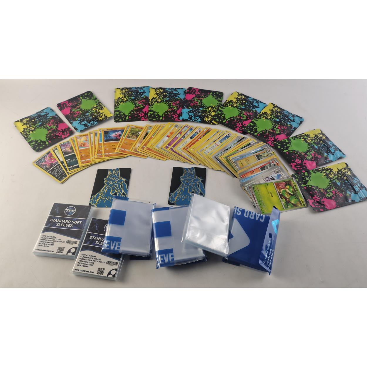 POKEMON Mega Elite trainer Evolution x2qty cards with other packs of pokemon cards unopened with a mixed lot of loose cards and a small box full of new sleeves