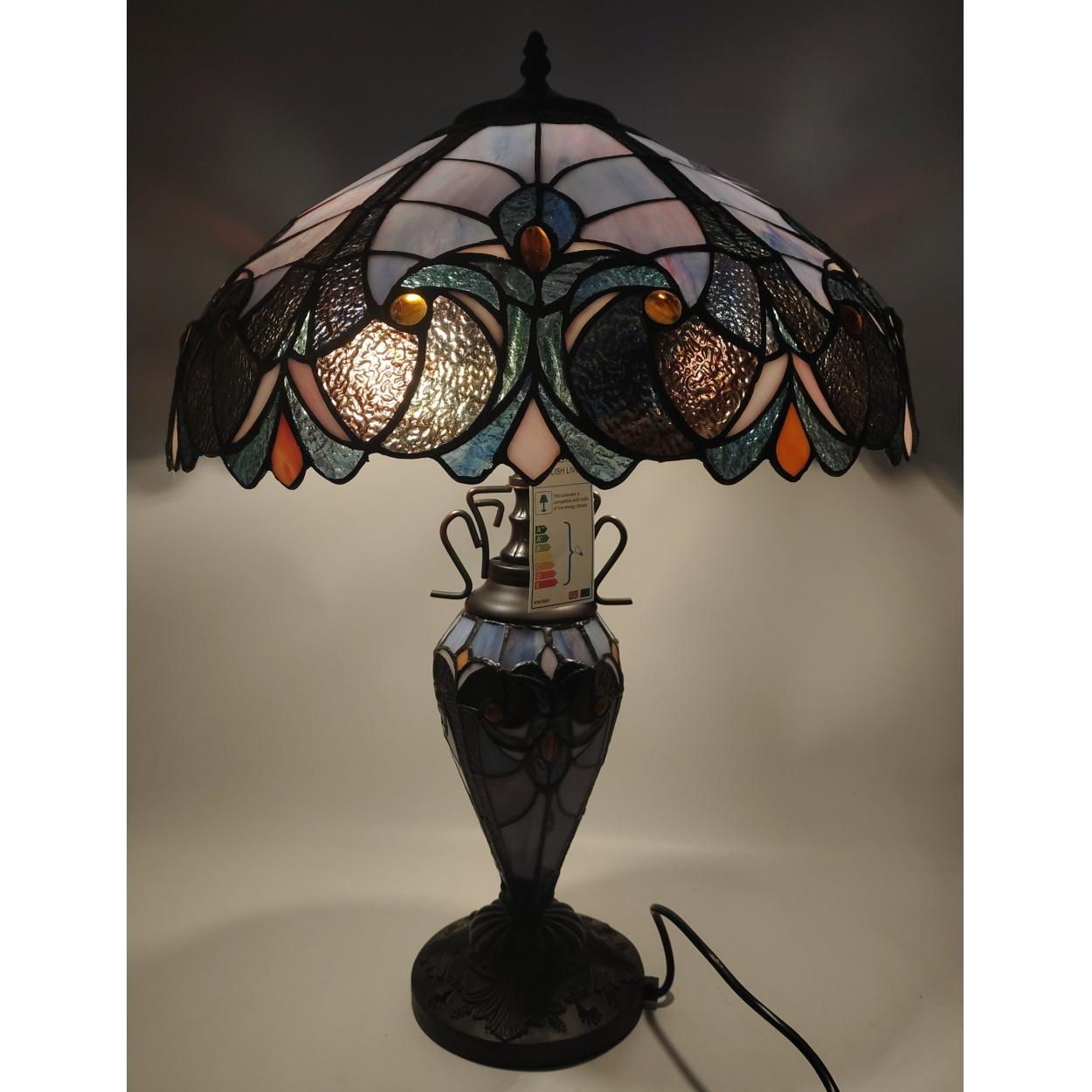 A large modern TIFFANY style table lamp with 46cm diameter shade and standing 60cm. Pretty piece with nice Lilac colourway and cabachons to shade.