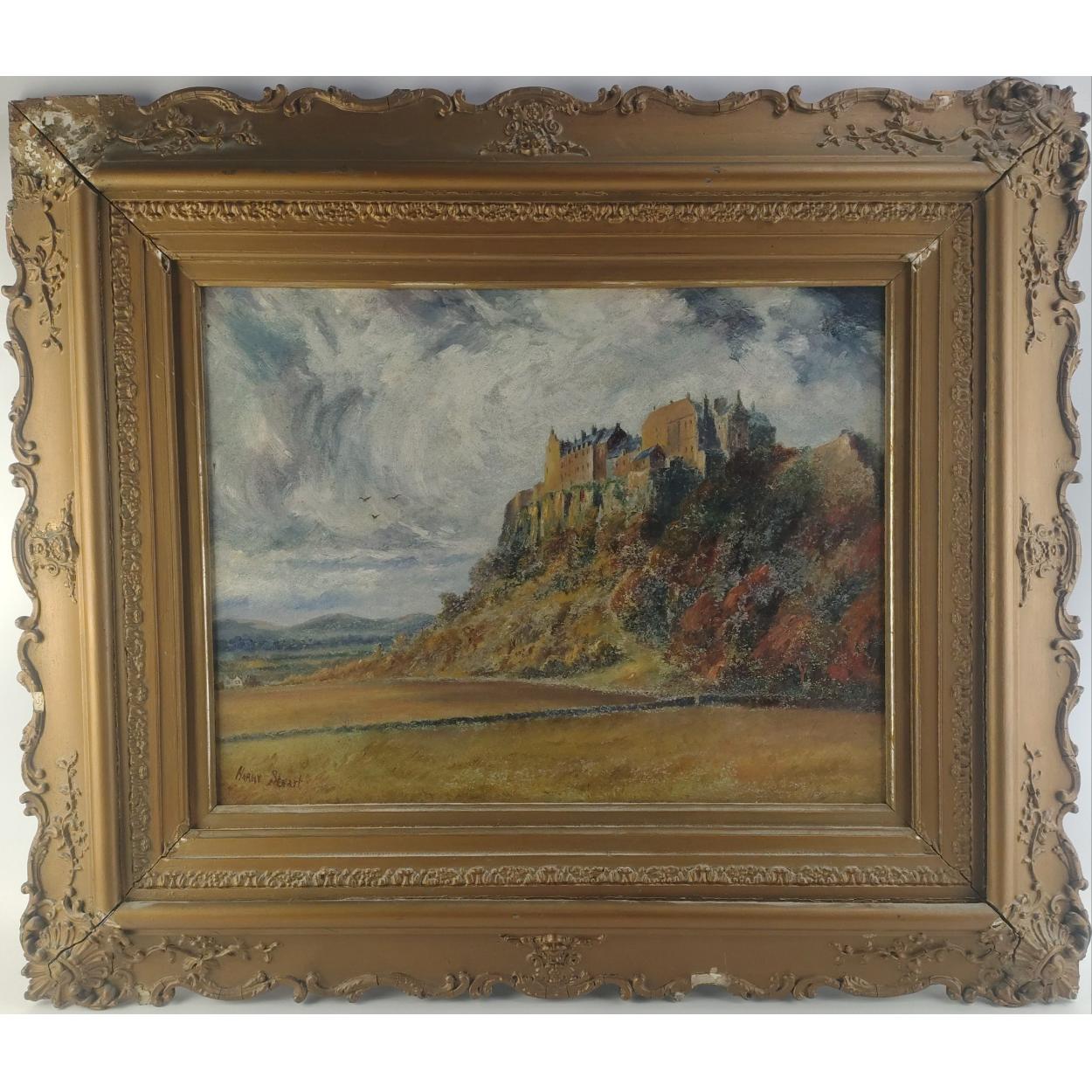 HARRY STUART oil on board of STIRLING CASTLE in gesso frame. Appealing brooding scene. Frame size 78cm x 68cm. Some damage to frame.