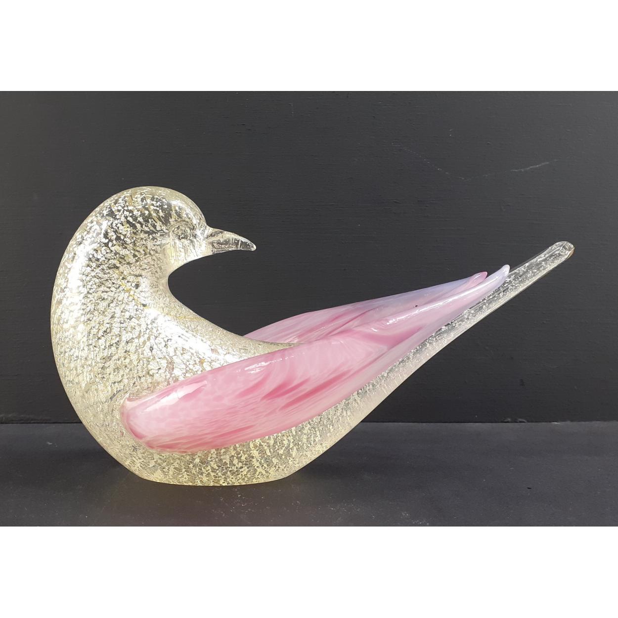 A HANDMADE MURANO style art glass bird, featuring a clear body with gold leaf inclusions and pink glass wings - dimensions 18cm length approx