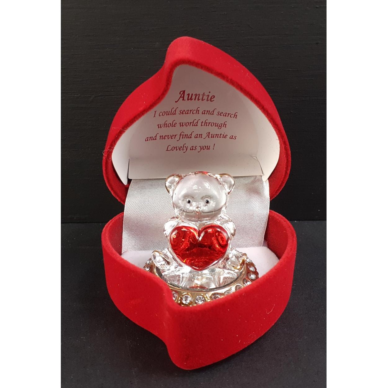 CUTE! An AUNTIE nice loving glass teddy bear gift in a red velvet jewellery box - the message insert says ' AUNTIE - I could search and search the whole world through and never find an auntie as Lovely as you' - stands 5cm tall approx
