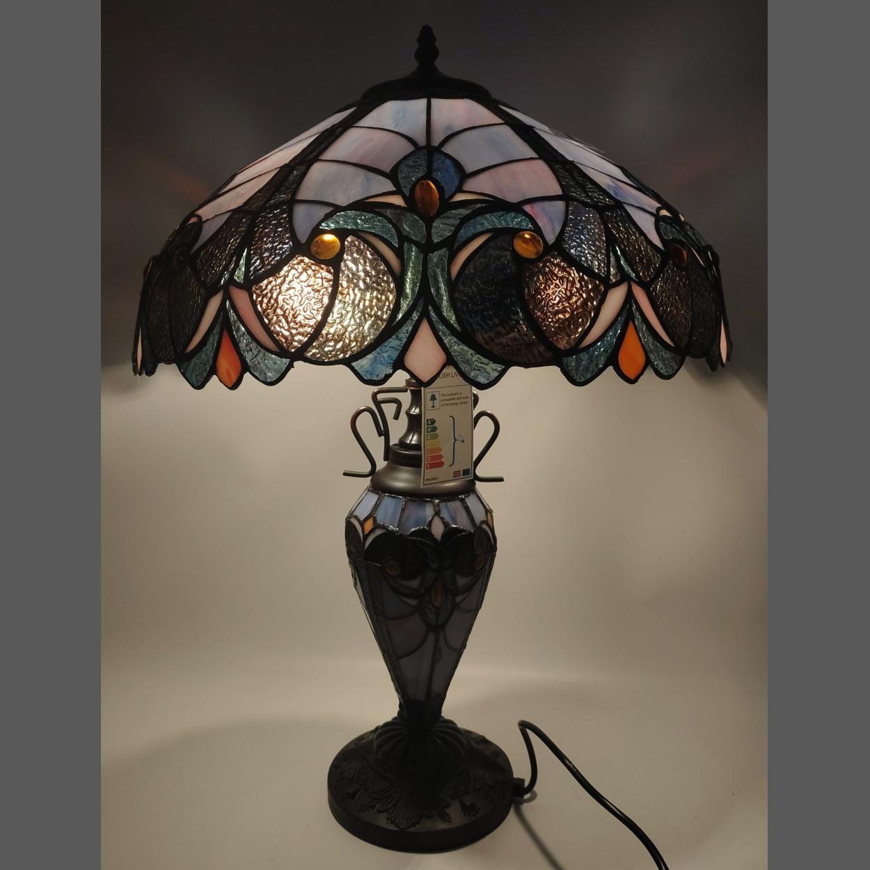 A large modern TIFFANY style table lamp with 46cm diameter shade and standing 60cm. Pretty piece with nice Lilac colourway and cabachons to shade.